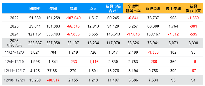 資料來源:EPFR Global, 2025/12/24。1新興市場合計為全球型新興市場、新興亞洲、拉丁美洲、新興歐非中東股票型基金加總。備註: 資料包含ETF與共同基金。 *2025年以來數據由2024/12/25起算。