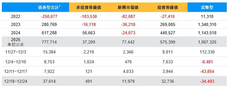 資料來源:EPFR Global, 2025/12/24。 1債券型合計為非投資等級債、新興市場債、投資等級債、市政債、MBS、政府債等各類債券型基金加總。備註: 資料包含ETF與共同基金。 *2025年以來數據由2024/12/25起算。