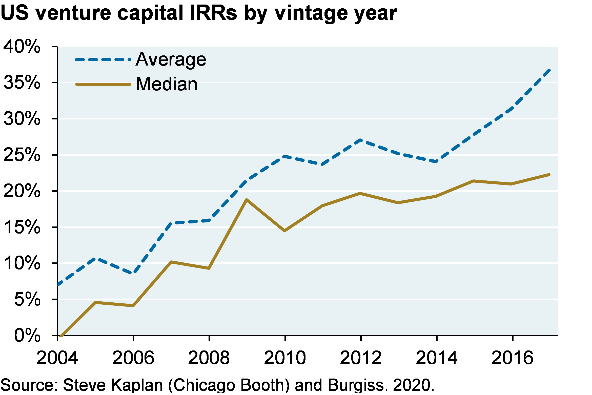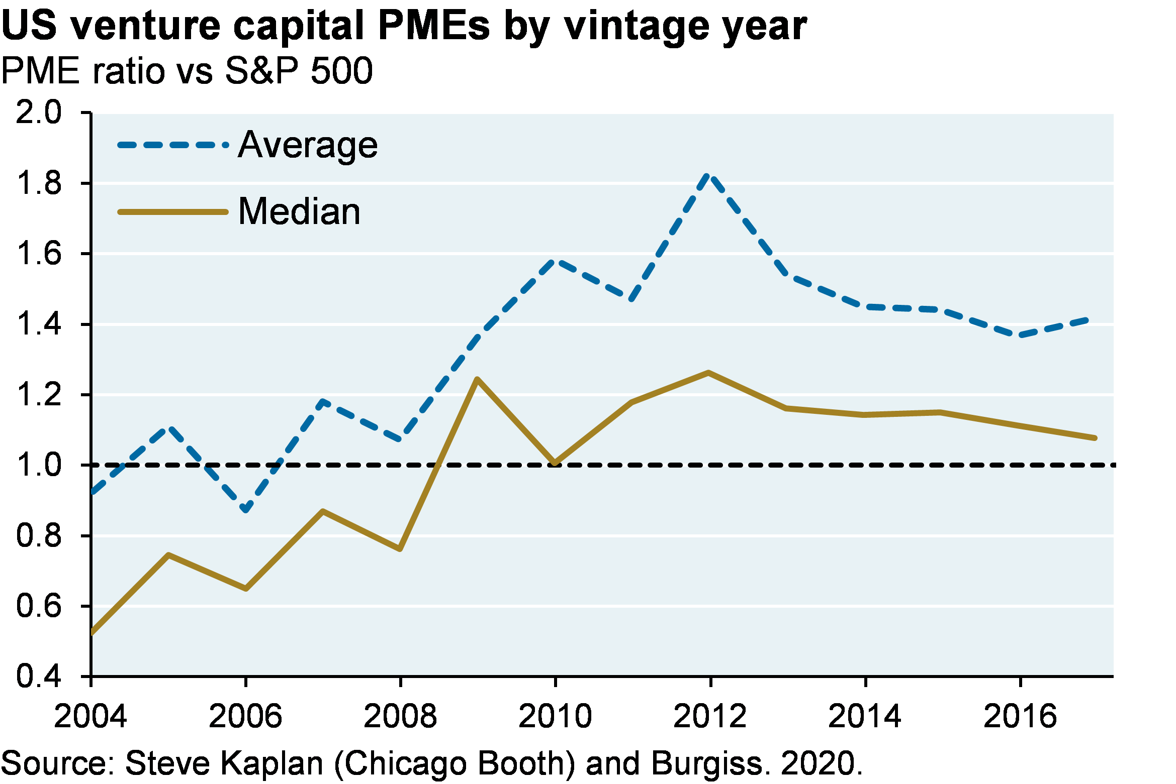 VC managers have consistently outperformed public equity markets when looking at the “average” manager. But to reiterate, the gap between average and median results are substantial and indicate outsized returns posted by a small number of VC managers. For vintage years 2004 to 2008, the median VC manager actually underperformed the S&P 500 pretty substantially.