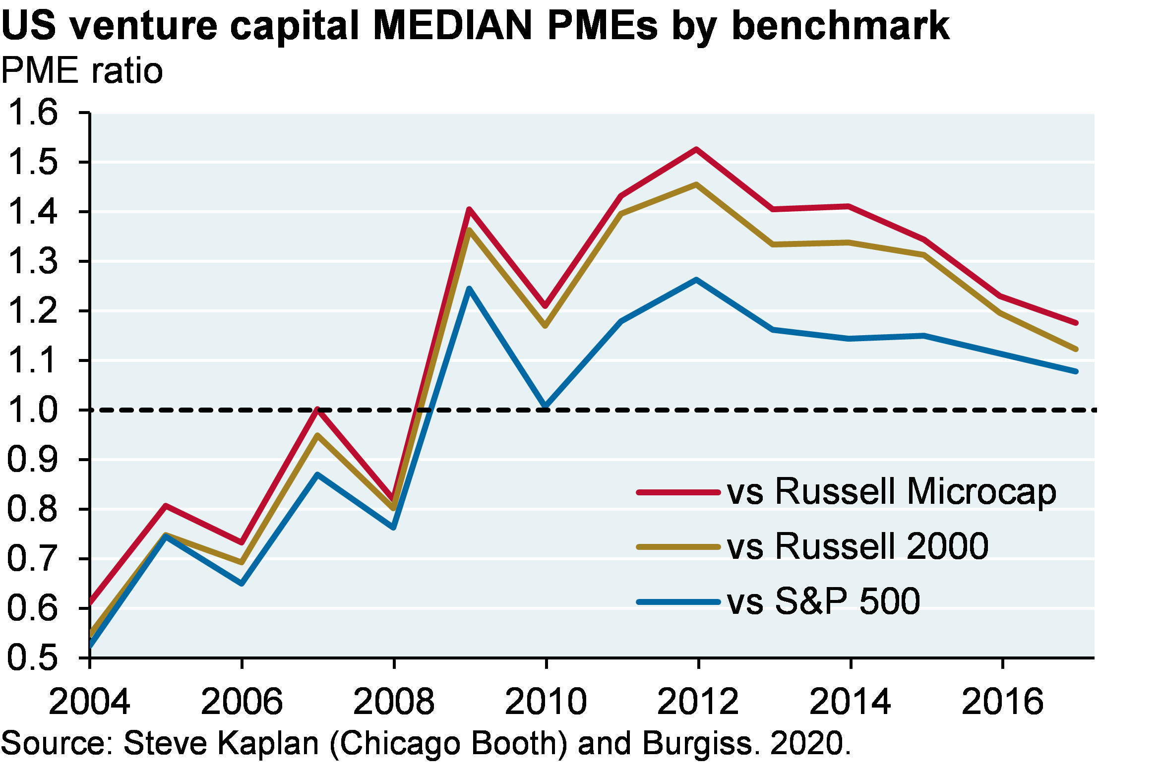 One could make an even stronger argument that the S&P 500 is not the right benchmark for venture capital given much smaller deal sizes. The first two charts show average and median PME ratios for VC using different benchmark options. Since the S&P 500 outperformed the Russell 2000 Index, the Russell 2000 Growth Index, the Russell Microcap Index and most other US equity benchmarks since 2010, using a different benchmark than the S&P 500 would simply make venture outperformance look larger since that date.