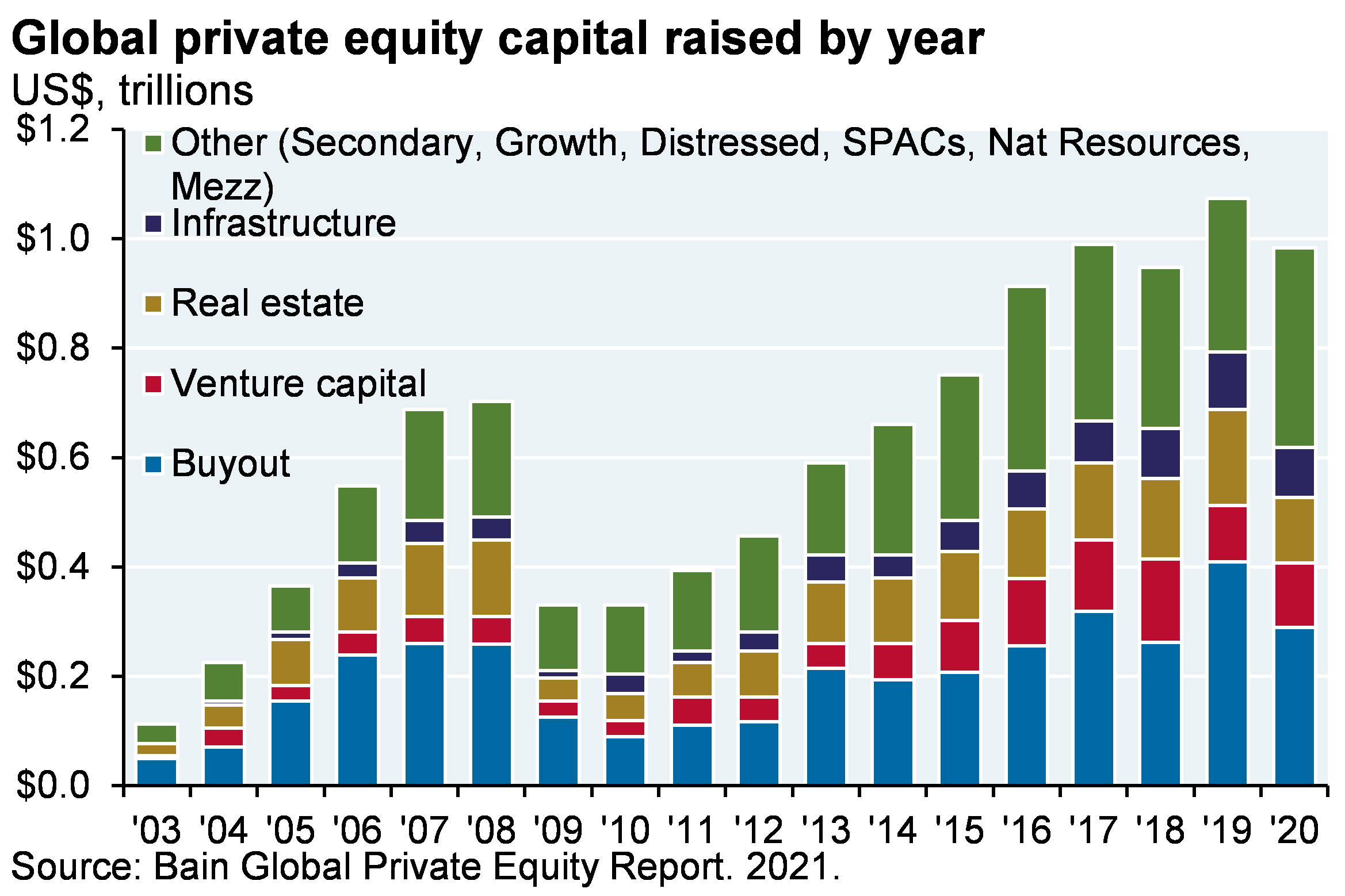 Why have relative buyout returns declined? After the financial crisis in 2008-2009, the Fed and other central banks adopted “maximum accommodation” policies. These policies led to a sharp rise in public equity valuations. In addition, buyout acquisition multiples have increased as the food fight over private companies continues, propelled further by the SPAC boom which we wrote about earlier this year. So, higher buyout purchase prices and better-performing public equities have reduced buyout outperformance.