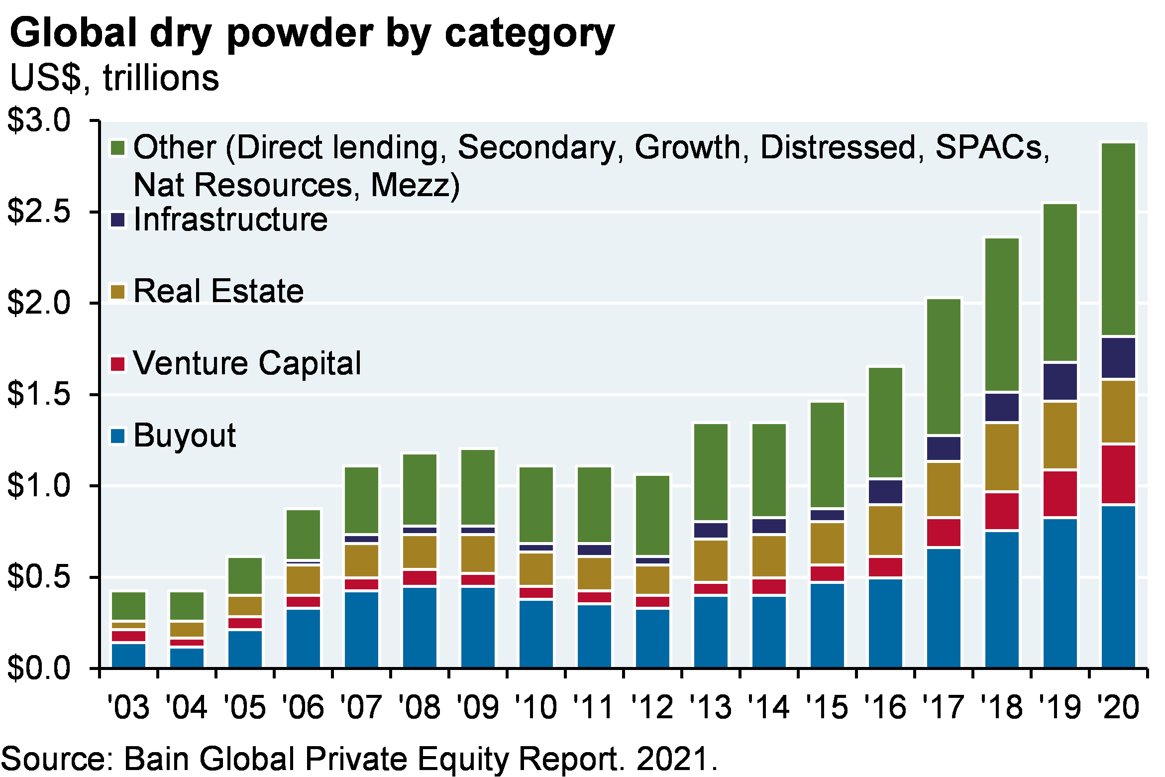 - Since the pace of new investment has trailed fundraising, global “dry powder” has exploded since our last analysis, rising from $2 trillion to ~$3 trillion. However, this figure includes all private equity categories and not just buyout and venture capital. For the latter two categories, dry powder is closer to $1 trillion