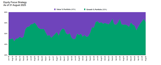JAM’s portfolio is built stock by stock, as each name clears a high hurdle to be considered as one of the 40 best ideas across US large cap value and growth equities. While each style is limited to a maximum of 20 large cap names, the weighting can tilt to 60%/40%—it’s currently 55%1growth/45%1 value—and the portfolio also holds 6%2 in a small cap blend fund.