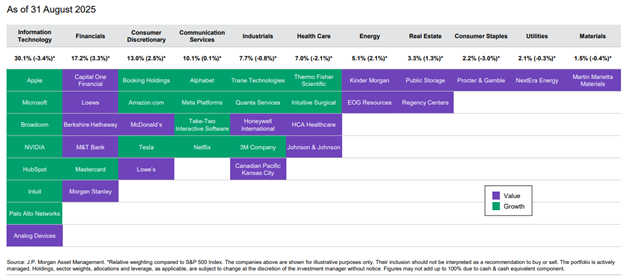 It starts with JAM’s focused and disciplined investment process to select 20 growth stocks and 20 value stocks. The growth and value portfolio managers source ideas from J.P. Morgan Asset Management’s 40 dedicated US equity research analysts and know exactly what they are looking for.