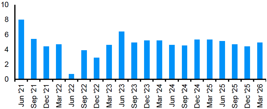 China's economy expanded 5.0% y/y in Q1, exceeding market expectations and accelerating from 4.5% prior. While the headline print looks upbeat, underlying activity data told a more mixed story. Industrial production outpaced forecasts at 5.7% y/y in March, supported by export strength, yet this further entrenched supply-demand imbalances even as capacity utilization edged down to 73.6%. On the demand side, retail sales disappointed at 1.7% y/y, with declines in autos, home appliances, and leisure goods raising concerns given these were targeted areas of policy support, while fixed asset investment also softened and urban unemployment unexpectedly ticked up to 5.4%. The strong headline reduces urgency for additional stimulus, with authorities now watching for Middle East spillovers rather than U.S. tariff impacts before deploying further support, and the 2026 growth trajectory appearing well-anchored within the official 4.5–5.0% target range. Middle East tensions remain a tail risk, potentially pushing up input costs and pressuring margins, though China's diversified energy mix offers relative insulation.