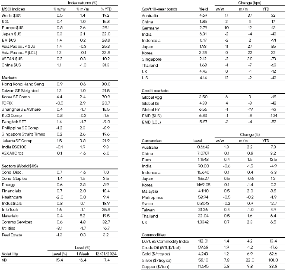 The Federal Reserve will meet this week to set monetary policy. But as the recent government shutdown has meant November’s non-farm payroll data was not available last week, markets have had to rely on alternative indicators to gauge the state of the labour market. However, these have provided limited insight – the ADP report tracked lower with 32k job losses and the Challenger report indicated a 71k announced job cuts in November, but these have contrasted with last week’s drop in initial jobless claims and continuing claims data, which points to resilience in the labour market. And although the series of dovish comments from Fed officials last month led markets to sharply increase the odds of a December rate cut, from 36% to 93%, the decisions this week, and especially the guidance on interest rate trajectory and economic projections, remains far from certain.
