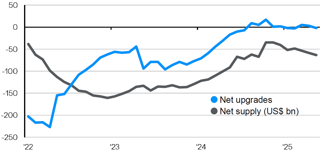 Asian credit has delivered robust performance this year, posting a 7.5% year-to-date return as spreads have continued to compress. Similar to other global credit markets, spreads are now approaching the lower bound of their historical range, leaving limited scope for further tightening. This dynamic has been partly driven by muted new issuance in Asian credit since 2022, as a strong dollar and elevated interest rates have discouraged corporates from issuing dollar-denominated debt, adding a supply-push factor to valuations. Additionally, as corporate balance sheets are strengthening and credit quality across Asia has recently shown consistent improvement this year. Rating upgrades have outpaced downgrades, most notably following S&P’s upgrade on India’s sovereign rating, which led to upgrades for a range of other Indian corporates. Consequentially, while valuations appear elevated across credit markets, the combination of solid fundamentals and supportive technicals suggest that Asian credit spreads may remain supported in the medium term.