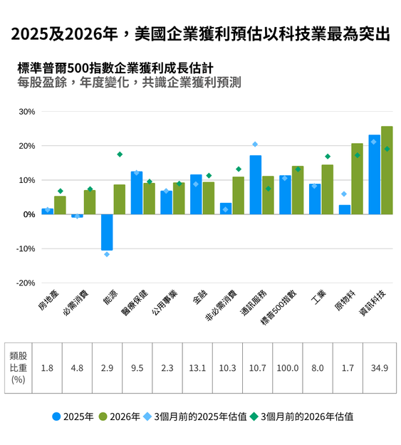 資料來源:FactSet,標準普爾,摩根資產管理。 所用共識企業獲利預測為FactSet的曆年估計。為維持較合理刻度,軸線可能將數值減列處理。 過去的表現並非目前及未來績效的可靠指標。 《環球市場縱覽 - 亞洲版》。最新資料:截至04/12/25。