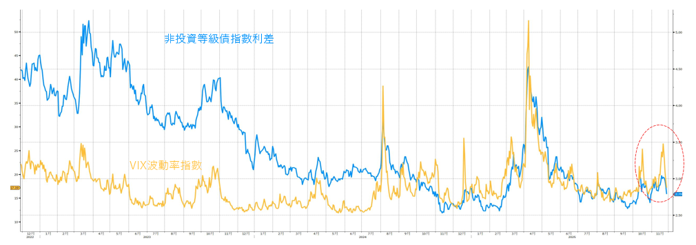 近期VIX指數面臨震盪,非投資等級債指數利差表現相對溫和
