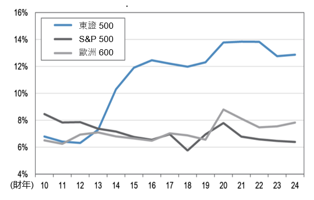 - 日本企業持有現金佔總資產比重明顯高於美國及歐洲,新政府正考慮推動公司治理改革,並且對於過剩現金課稅,預期公司資產負債表上的現金資產將流入投資、薪資成長和回饋股東,創造日股長期投資價值。