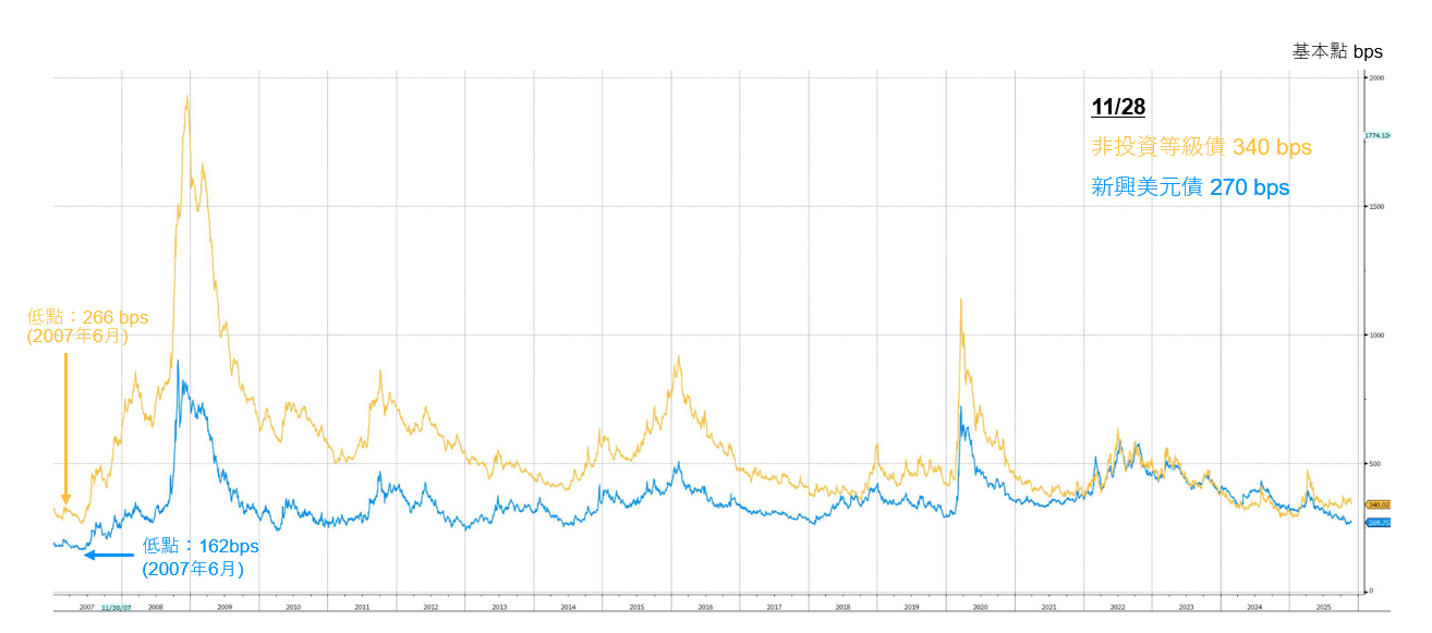資料來源:Bloomberg,非投資等級債指數利差係以彭博美國非投資等級債券指數為代表。資料日期:2025年11月27日。