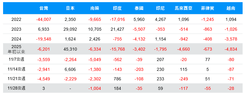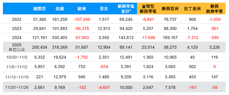 資料來源:EPFR Global, 2025/11/26。1新興市場合計為全球型新興市場、新興亞洲、拉丁美洲、新興歐非中東股票型基金加總。備註: 資料包含ETF與共同基金。 *2025年以來數據由2024/12/25起算。