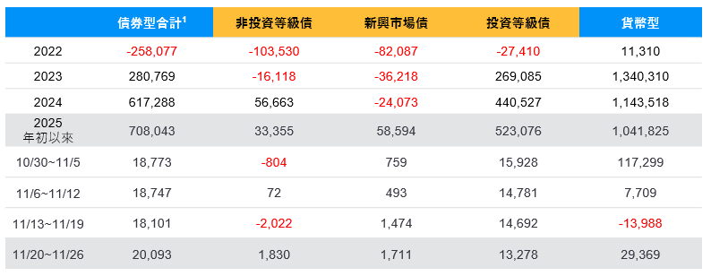 資料來源:EPFR Global, 2025/11/26。 1債券型合計為非投資等級債、新興市場債、投資等級債、市政債、MBS、政府債等各類債券型基金加總。備註: 資料包含ETF與共同基金。 *2025年以來數據由2024/12/25起算。