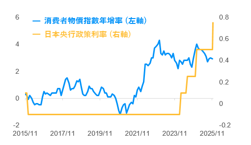 - 儘管日本11月份消費者物價指數年增率降至2.9%,通膨仍持續高於政策目標2%,日本央行於19日調升政策利率一碼至0.75%,且預期勞工薪資在2026年將穩步增長,企業利潤逐步改善,政府認為升息不致衝擊經濟成長,相反地,隨著貨幣政策正常化,有助於改善金融機構獲利及經濟體質。