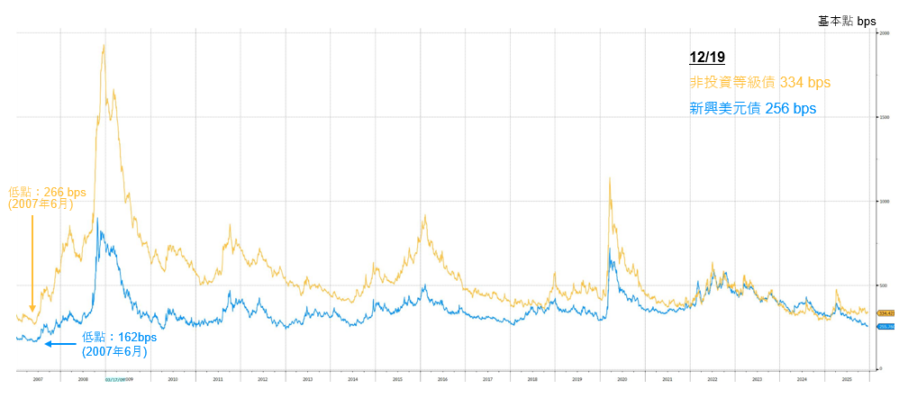 資料來源:J.P. Morgan, 資料日期:2025.12.19.。摩根非投資等級債指數及摩根新興市場債券指數分別採J.P. Morgan Domestic High Yield Index及J.P. Morgan EMBI Global Diversified Index,利差使用Spread to Worst / 指數舉例為投資參考,惟投資人無法直接投資該指數