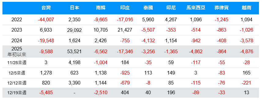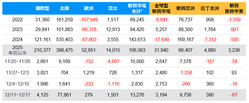 資料來源:EPFR Global, 2025/12/17。1新興市場合計為全球型新興市場、新興亞洲、拉丁美洲、新興歐非中東股票型基金加總。備註: 資料包含ETF與共同基金。 *2025年以來數據由2024/12/25起算。