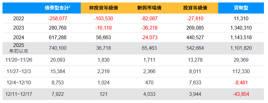 資料來源:EPFR Global, 2025/12/17。 1債券型合計為非投資等級債、新興市場債、投資等級債、市政債、MBS、政府債等各類債券型基金加總。備註: 資料包含ETF與共同基金。 *2025年以來數據由2024/12/25起算。