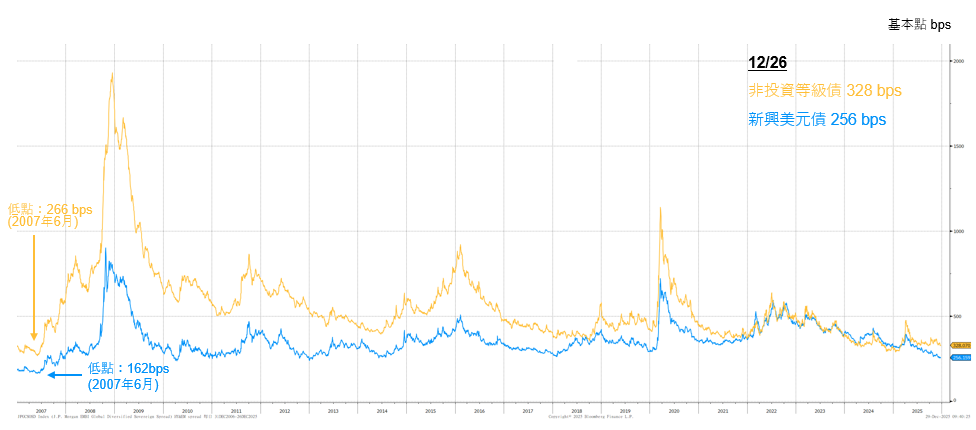 資料來源:J.P. Morgan, 資料日期:2025.12.26.。摩根非投資等級債指數及摩根新興市場債券指數分別採J.P. Morgan Domestic High Yield Index及J.P. Morgan EMBI Global Diversified Index,利差使用Spread to Worst / 指數舉例為投資參考,惟投資人無法直接投資該指數