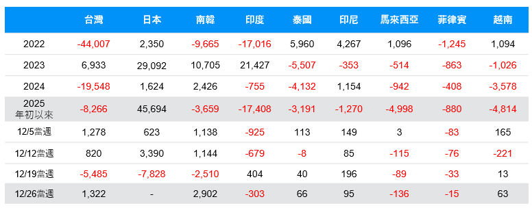 資料來源:EPFR Global, 2025/12/24。1新興市場合計為全球型新興市場、新興亞洲、拉丁美洲、新興歐非中東股票型基金加總。備註: 資料包含ETF與共同基金。 *2025年以來數據由2024/12/25起算。