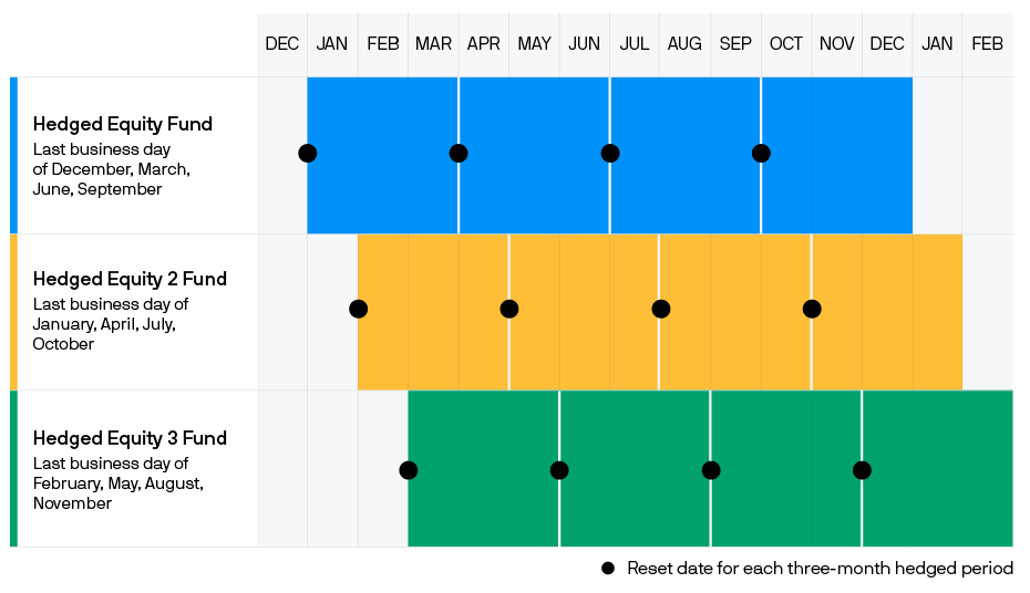 The three Hedged Equity funds employ a disciplined options strategy on staggered start dates that reset every three months. At the beginning of each hedge period, an options overlay strategy is implemented based on where the market is at that point. So, you get a consistent hedged experience no matter when you invest.