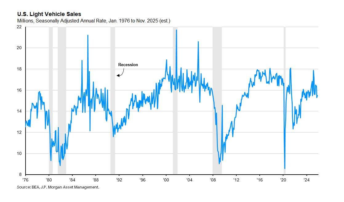 In the short run, the auto industry will likely be less pivotal for investors. Auto stocks themselves, with the exception of Tesla, represent a miniscule part of the U.S. equity market and vehicle sales will likely take a backseat to the conflicting forces of economic nationalism and technology investment in determining the economic and market fortunes of 2026.