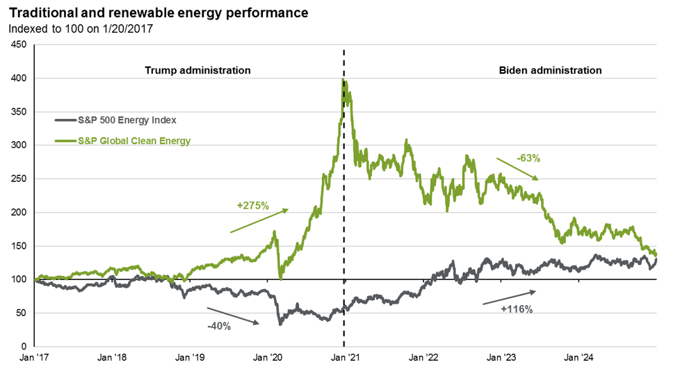 - Energy could also benefit, although with oil production already at high capacity, this may not result in a meaningful increase in oil supply in the short run. On the other hand, renewables and EV subsidies enacted in the Inflation Reduction Act could be at risk.