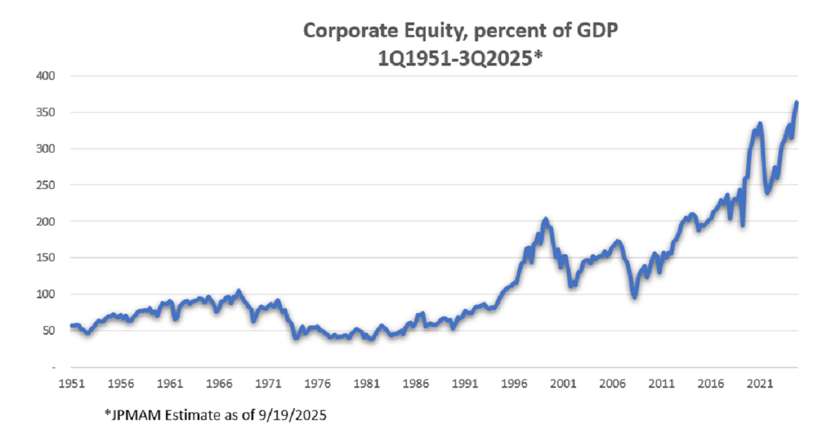 Between the third quarter of 1955 and the third quarter of 1985, the value of all U.S. corporate equity averaged 72% of GDP. It then started a remarkable ascent, reaching 212% by the first quarter of the new century, just before the dot-com bubble burst and, we estimate, attaining a record high of 363% last Friday.